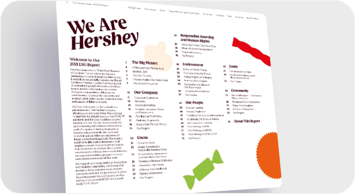 2 The Hershey Company | 2021 ESG Report The Big Picture Our Company Cocoa Responsible Sourcing and Human Rights Environment Our People Youth Community About This Report re 33 A Responsible Sourcing We and Human Rights 34 Human Rights Across Our Value Chain y rshe 38 Where We Source Our Ingredients e 39 Responsible Sourcing H 43 Our Progress Welcome to Our 48 3 The Big Picture E nvironment 80 Youth 2021 ESG Report 4 A Message From Michele Buck 49 Acting on Climate Change 81 The Heartwarming Project Hershey’s purpose is to “Make More Moments 5 Spotlight 2021 52 Employees Acting for Change 84 Our Shared Goodness Legacy — of Goodness” for our consumers for many 6 Our ESG Priorities 53 Making Progress on Packaging Milton Hershey School generations to come. Integral to achieving that 7 Progress Against Our Priority Goals 54 Protecting Water Supplies 85 Our Progress is our holistic sustainability strategy: our Shared 9 Awards and Recognition 55 Our Journey to Understand Goodness Promise. It guides how we empower Our Water Impact the remarkable people who make and sell our 86 brands, interact with farming communities 56 Innovating Waste Solutions Community 10 that grow our ingredients, deliver on our Our Company 57 Our Progress 87 Values With Impact — How Hershey commitments to consumers, customers and 11 Corporate Governance Makes a Difference external stakeholders, protect the environment 13 Materiality 88 Showing up for Our Communities and support children and youth. 62 Our People 2021 was a testament to the fortitude and 14 Our Snacks Portfolio 89 Being a Good Neighbor 15 Nutrition, Innovation, Choice 63 Stronger Together 90 A Culture of Giving Back perseverance of The Hershey Company, and Transparency 64 Keeping People Safe allowing us to ultimately thrive. We continued 92 Our Progress to deal with the global impacts of the COVID-19 16 Excellence in Food Safety 65 Providing a Caring Employee Experience pandemic and the need to address systemic 17 Marketing Responsibly 67 Accelerating DEI Efforts at Hershey racism in the U.S. This was the year we hit the 18 Staying Agile Through Change 68 2021: Living DEI at Hershey 93 About This Report ground running with ambitious new inclusion 69 More Pathways to JOIN goals. A majority of Hershey employees in 19 Our Progress manufacturing and retail roles continued 71 More Pathways to GROW to work in-person while our corporate staff 73 More Pathways to REACH OUT began a more hybrid approach. The ongoing 20 Cocoa 74 Our Progress need for flexible work environments for all 21 Cocoa For Good employees meant they needed more support than ever before. In addition, the economic 22 Deeply Committed to consequences of the pandemic made delivering Responsibly Sourcing Cocoa our supportive resiliency programs to cocoa 23 Accountability, Transparency communities more essential than ever. and Due Diligence in Cocoa We stepped up to every challenge, facing them 24 Working to Eliminate Child Labor with flexibility, adaptability, compassion and 26 Prevention Is the Priority resilience. As we overcame issues, we were 27 Lifting up Rural Livelihoods constantly reminded: we are stronger together. By putting people first and focusing on what 29 Fighting Deforestation matters most, we ended 2021 stronger and 31 Our Progress ready for the future.