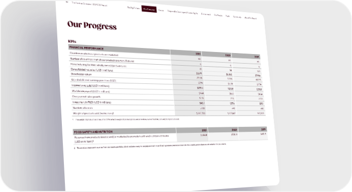 19 The Hershey Company | 2021 ESG Report The Big Picture Our Company Cocoa Responsible Sourcing and Human Rights Environment Our People Youth Community About This Report Our Company Our Progress KPIs FINANCIAL PERFORMANCE 2021 2020 2019 Countries in which our products are marketed 80 85 85 Number of countries in which our products are manufactured 6 6 6 Manufacturing facilities: wholly owned/joint ventures 15 14 15/1 Consolidated net sales (USD in millions) $8,971 $8,150 $7,986 Shareholder return 29.6% 5.91% 40.2% Adjusted diluted earnings per share (USD) $7.19 $6.29 $5.78 Income taxes paid (USD in millions) $275.2 $215.5 $238.1 Worldwide payroll (USD in millions) $924 $863 $834 One year net sales growth 10.1% 2.1% 2.5% Investment in R&D (USD in millions) $40.1 $37.6 $37.1 Number of brands >100 >90 >80 1 Weight of products sold (metric tons) 1,085,720 1,027,447 907,205 1 The weight of products sold result for 2019 reflects weight of product produced at Hershey-owned facilities, not weight of products sold. FOOD SAFETY AND NUTRITION 2021 2020 2019 Revenue from products labeled and/or marketed to promote health and nutrition attributes $644.4 $520.8 $432.3 2 (USD in millions) 2 These values represent revenue from our snacks portfolio, which includes ready-to-eat popcorn with no artificial ingredients, baked and trans-fat-free snacks, protein bars and other better-for-you snacks.