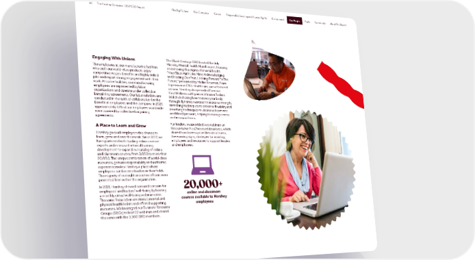 66 The Hershey Company | 2021 ESG Report The Big Picture Our Company Cocoa Responsible Sourcing and Human Rights Environment Our People Youth Community About This Report Our People Engaging With Unions The Black Heritage BRG hosted the July The employees at our manufacturing facilities Minority Mental Health Month event, focusing who craft our world-class products enjoy on removing the stigma of mental health. competitive wages, benefits and highly skilled “Your Blues Ain’t Like Mine; Acknowledging jobs and report strong engagement with their and Healing Our Past, Looking Forward To The work. At some facilities, our manufacturing Future,“ presented by Malkia Newman, Team employees are represented by labor Supervisor at CNS Healthcare, was a featured organizations and operate under collective session. Hershey also provided Exercise bargaining agreements. Our labor relations are Your Wellness with personal trainer Bodine conducted in the spirit of collaboration for the Wolchuk sharing how to move your body benefit of employees and the company. In 2021, through dynamic exercises to increase strength, approximately 33% of our employees worldwide stretching techniques to enhance flexibility and were covered by collective bargaining breathing techniques to decrease heart rate agreements. and blood pressure, helping to manage stress and increase focus. A Place to Learn and Grow For leaders, we provided two webinars on Recognizing The Distressed Employee, which Hershey gives all employees the chance to shared how to recognize the role of stress, learn, grow and own their work. Since 2017, we the warning signs, strategies for assisting have partnered with leading online content employees and resources to support leaders experts and increased internal learning and employees. development to expand our catalog of online and classroom courses from 3,000 to more than 20,000. This unique combination of world-class resources, genuine responsibility and authentic experience makes Hershey a place where employees can become leaders in their fields. The majority of our eight executive officers were promoted from within the organization. In 2021, Hershey showed care and concern for 20,000+ employees’ and leaders’ well-being by hosting online and classroom a monthly virtual well-being webinar series. courses available to Hershey The series focused on emotional, mental and physical health habits and offered supporting employees resources. We leveraged our Business Resource Groups (BRGs) to host 22 webinars and shared the series with the 3,300 BRG members.