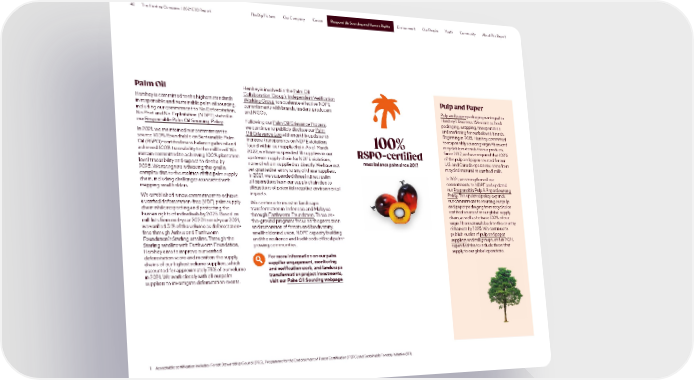 42 The Hershey Company | 2021 ESG Report Responsible Sourcing and Human Rights The Big Picture Our Company Cocoa Responsible Sourcing and Human Rights Environment Our People Youth Community About This Report Palm Oil Hershey is involved in the Palm Oil Collaboration Group’s Independent Verification Pulp and Paper Hershey is committed to the highest standards Working Group to accelerate effective NDPE in responsible and sustainable palm oil sourcing, commitments with brands, traders, producers Pulp and paper packaging is integral to including our commitment to No Deforestation, and NGOs. Hershey’s business. We use it as food No Peat and No Exploitation (NDPE) stated in Following our Palm Oil Grievance Process, packaging, wrapping, transportation our Responsible Palm Oil Sourcing Policy. we continue to publicly disclose our Palm and marketing for our beloved brands. In 2021, we maintained our commitment to Oil Grievance Log with monthly updates to Beginning in 2015, Hershey committed source 100% Roundtable on Sustainable Palm increase transparency on NDPE violations to responsibly sourcing virgin fibers and Oil (RSPO)-certified mass balance palm oil and found within our supply chain. As of March 100% recyclable materials for our products. achieved 100% traceability to the mill level. We 2022, we have suspended 18 suppliers in our Since 2017, we have required that 100% remain committed to achieving 100% plantation upstream supply chain for NDPE violations, RSPO-certified of the pulp and paper sourced for our level traceability and expect to do this by none of whom supplied us directly. We have not mass balance palm since 2017 U.S. and Canada operations come from 1 2025. We recognize achieving this goal is yet granted re-entry to any of these suppliers. recycled material or certified mills. complex due to the realities of the palm supply In 2021, we suspended three indirect palm In 2021, we strengthened our chain, including challenges associated with oil operations from our supply chain due to commitments to NDPE and updated mapping smallholders. allegations of potential negative environmental our Responsible Pulp & Paper Sourcing We established a new commitment to achieve impacts. Policy. The updated policy expands a verified deforestation-free (VDF) palm supply We continue to invest in landscape our commitment to sourcing our pulp chain while respecting and protecting the transformation in Indonesia and Malaysia and paper packaging from recycled or human rights of individuals by 2025. Based on through Earthworm Foundation. These on- certified sources for our global supply mill lists from mid-year 2020 to mid-year 2021, the-ground programs focus on the protection chain, as well as to trace 100% of our we verified 51% of the volume as deforestation- and restoration of forests and biodiversity, virgin fiber materials back to the country free through Airbus and Earthworm smallholder inclusion, NDPE capacity building of harvest by 2025. We continue to Foundation’s Starling satellite. Through the and the resilience and livelihoods of local palm- publish our list of pulp and paper Starling satellite with Earthworm Foundation, growing communities. suppliers and mill groups, and in 2021, Hershey aims to improve our verified expanded this to include those that deforestation score and monitors the supply For more information on our palm supply to our global operations. chains of our highest volume suppliers, which supplier engagement, monitoring accounted for approximately 79% of our volume and verification work, and landscape in 2021. We work closely with all our palm transformation project investments, suppliers to investigate deforestation events. visit our Palm Oil Sourcing webpage. 1 Acceptable certification includes: Forest Stewardship Council (FSC), Programme for the Endorsement of Forest Certification (PEFC) and Sustainable Forestry Initiative (SFI).
