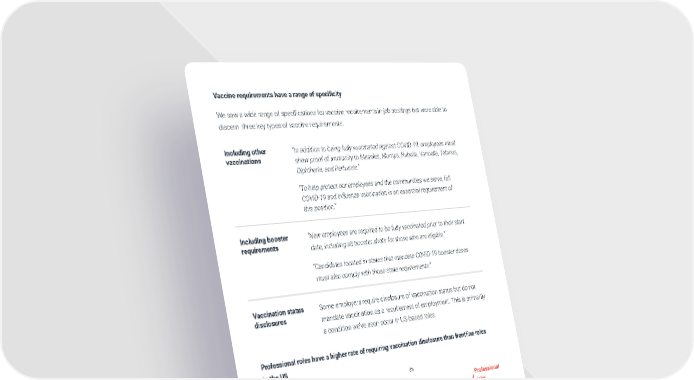 Vaccine requirements have a range of specificity We saw a wide range of specifications for vaccine requirements in job postings but were able to discern three key types of vaccine requirements: Including other “In addition to being fully vaccinated against COVID-19, employees must vaccinations show proof of immunity to Measles, Mumps, Rubella, Varicella, Tetanus, Diphtheria, and Pertussis.” “To help protect our employees and the communities we serve, full COVID-19 and Influenza vaccination is an essential requirement of this position.” Including booster “New employees are required to be fully vaccinated prior to their start requirements date, including all booster shots for those who are eligible.” “Candidates located in states that mandate COVID-19 booster doses must also comply with those state requirements.“ Vaccination status Some employers require disclosure of vaccination status but do not disclosures mandate vaccination as a requirement of employment. This is primarily a condition we've seen occur in US-based roles. Professional roles have a higher rate of requiring vaccination disclosure than frontline roles in the US In the US, vaccination status disclosures were significantly lower than vaccination requirements, although both grew significantly in 2022. Moreover, professional roles have higher rates of vaccination status disclosure than frontline roles. In 2022, 2% of professional roles contain vaccination status disclosure requirements, a 6x increase compared to 2021. Vaccination requirements went through a 17x increase in frontline roles, from being present in 0.1% of job posts in 2021 to 1.7% in 2022. © Tapwage Inc 2022 24