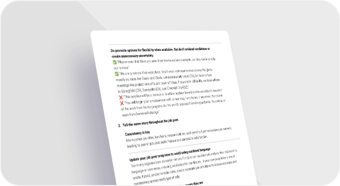Do promote options for flexibility when available. But don’t mislead candidates or create unnecessary uncertainty. ✅ “Please note that there are work from home options available, but this role is strictly not remote.” ✅ “We are a remote-first workplace. You’ll work with teammates across the globe, mostly via tools like Zoom and Slack, but occasionally travel (5%) for face-to-face meetings like project kick-offs and team offsites. If you prefer office life, we have offices in Springfield (OR), Sunnyville (CA), and Emerald City (OZ).” ❌ “This position will be a remote or in-office position based on the candidate’s location.” ❌ “You will begin your employment with us working from home, if you meet the criteria of the work-from-home program. As the world recovers from the pandemic, the criteria of work from home will change.” 2. Tell the same story throughout the job post. Consistency is key Mismatched job titles, locations, responsibilities, and benefits & perks confuse job seekers, leading to poorer job post performance and candidate satisfaction. Update your job post templates to avoid using outdated language Too many organizations describe remote-first jobs yet accidentally include their old benefits language or vice versa, creating confusion for candidates. If your company hires a mix of onsite, hybrid, and/or remote roles, create separate job templates to ensure accuracy and consistency across each type of role. 3. Treat job posts like the marketing documents they are Advertise your benefits – that are consistent with the job If a job is remote, don’t reference perks specific to the office (how nice it is, the catered dinners, commuter benefits). Define benefits & perks templates for different types of roles – remote, hybrid, onsite – rather than describing all of the benefits for all roles (or no benefits at all). © Tapwage Inc 2022 27