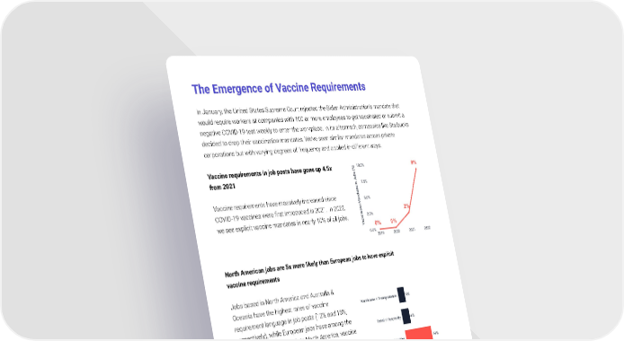 The Emergence of Vaccine Requirements In January, the United States Supreme Court rejected the Biden Administration’s mandate that would require workers at companies with 100 or more employees to get vaccinated or submit a negative COVID-19 test weekly to enter the workplace. In its aftermath, companies like Starbucks decided to drop their vaccination mandates. We’ve seen similar mandates across private corporations but with varying degrees of frequency and applied in different ways. Vaccine requirements in job posts have gone up 4.5x from 2021 Vaccine requirements have massively increased since COVID-19 vaccines were first introduced in 2021. In 2022, we see explicit vaccine mandates in nearly 10% of all jobs. North American jobs are 5x more likely than European jobs to have explicit vaccine requirements Jobs based in North America and Australia & Oceania have the highest rates of vaccine requirement language in job posts (12% and 16%, respectively), while European jobs have among the lowest (<2% of job posts). In North America, vaccine mandates are higher among professional jobs. In Australia & Oceania, vaccine mandates are higher among frontline jobs. While it’s difficult to say for certain why this is, it’s possible that labor market tightness in the US is prompting companies struggling to hire frontline talent to reduce their job requirements. Regional differences in COVID-19 measures may also be the cause. © Tapwage Inc 2022 21