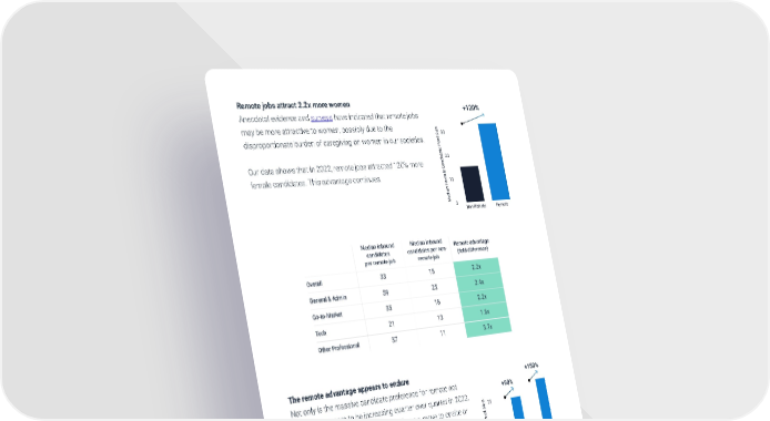 Remote jobs attract 2.2x more women Anecdotal evidence and surveys have indicated that remote jobs may be more attractive to women, possibly due to the disproportionate burden of caregiving on women in our societies. Our data shows that in 2022, remote jobs attracted 120% more female candidates. This advantage continues. The remote advantage appears to endure Not only is the massive candidate preference for remote not waning, it appears to be increasing quarter over quarter in 2022. It is likely that as more companies indicate a move to onsite or hybrid, candidates specifically gravitate to remote jobs. © Tapwage Inc 2022 8