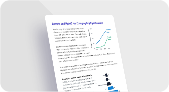 Remote and Hybrid Are Changing Employer Behavior Was the surge of remote jobs a pandemic-related phenomenon or was the pandemic a catalyst for a bigger shift in the way we work? The data is starting to suggest the latter, with remote jobs continuing the exponential shift deep into 2022. Despite the easing of public health restrictions in many locations, the pandemic-related increase in the adoption of remote work has not significantly reversed, indicating that remote work is a permanent feature of work life. Remote jobs continue to grow rapidly and account for 10% of all professional jobs – a 5x increase from 2019. Most remote roles have some form of a geographical restriction – typically country or state. City-based remote/work-from-home roles are popular, but this bleeds into the debate as to whether those roles can be truly considered remote versus hybrid. Remote jobs are most popular in North America In 2022, remote jobs are less popular outside of North America and Europe. In North America, remote jobs account for almost 1 in 7 professional jobs in the US and 1 in 10 professional jobs in Canada. Remote jobs are more popular in the UK than in continental Europe, accounting for 8% and 6% of professional jobs, respectively. © Tapwage Inc 2022 9