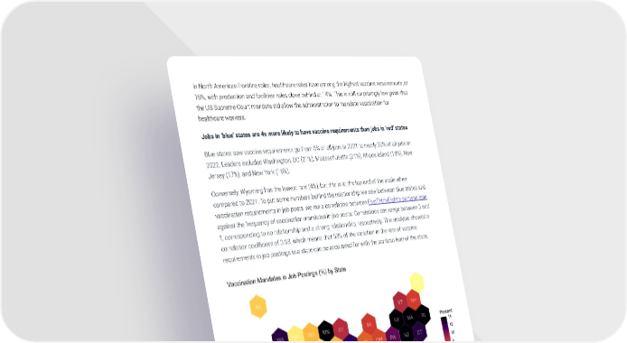 In North American frontline roles, healthcare roles have among the highest vaccine requirements, at 16%, with production and facilities roles close behind at 14%. This is still surprisingly low given that the US Supreme Court mandate did allow the administration to mandate vaccination for healthcare workers. Jobs in ‘blue’ states are 4x more likely to have vaccine requirements than jobs in ‘red’ states Blue states saw vaccine requirements go from 5% of all jobs in 2021 to nearly 20% of all jobs in 2022. Leaders included Washington, DC (21%), Massachusetts (21%), Rhode Island (18%), New Jersey (17%), and New York (16%). Conversely, Wyoming has the lowest rate (4%), but this is at the top end of the scale when compared to 2021. To put some numbers behind the relationship we saw between blue states and vaccination requirements in job posts, we ran a correlation between FiveThirtyEight’s partisan lean against the frequency of vaccination mandates in job posts. Correlations can range between 0 and 1, corresponding to no relationship and a strong relationship, respectively. This analysis showed a correlation coefficient of 0.63, which means that 63% of the variation in the rate of vaccine requirements in job postings in a state can be accounted for with the partisan lean of the state. © Tapwage Inc 2022 22