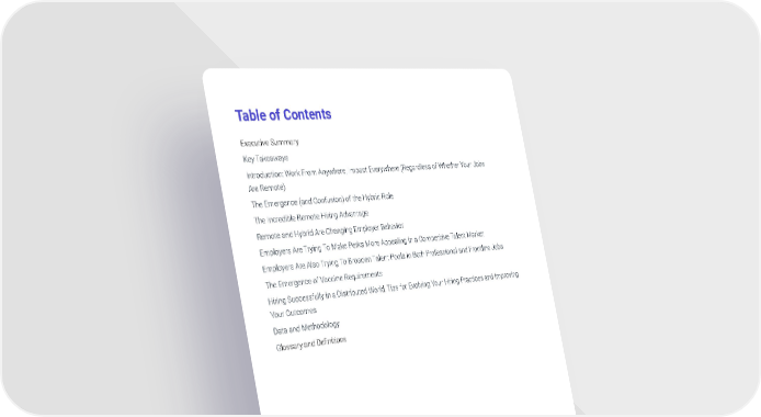 Table of Contents Executive Summary Key Takeaways Introduction: Work From Anywhere, Impact Everywhere (Regardless of Whether Your Jobs Are Remote) The Emergence (and Confusion) of the Hybrid Role The Incredible Remote Hiring Advantage Remote and Hybrid Are Changing Employer Behavior Employers Are Trying To Make Perks More Appealing in a Competitive Talent Market Employers Are Also Trying To Broaden Talent Pools in Both Professional and Frontline Jobs The Emergence of Vaccine Requirements Hiring Successfully in a Distributed World:Tips for Evolving Your Hiring Practices and Improving Your Outcomes Data and Methodology Glossary and Definitions © Tapwage Inc 2022 1