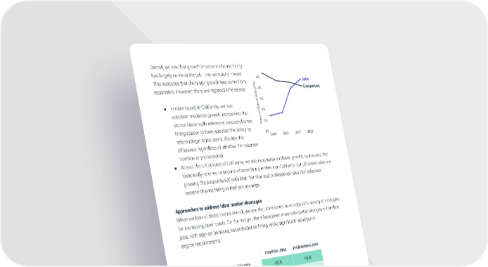 Overall, we see that growth in second-chance hiring has largely come at the job – not company – level. This indicates that the major growth has come from expansion. However, there are regional differences: ● In roles based in California, we see adoption-mediated growth: companies that did not historically reference second-chance hiring appear to have adopted the policy by referencing it in job posts. We see this difference regardless of whether the roles are frontline or professional. ● Across the US outside of California, we see expansion-mediated growth: companies that historically referred to second-chance hiring in their non-California but US-based roles are growing the proportion of both their frontline and professional roles that reference second-chance hiring in their job postings. Approaches to address labor market shortages When we look at these trends overall, we see that companies have adopted a variety of strategies for increasing labor pools. On the margin, there have been more substantial changes in frontline jobs, with sign-on bonuses, second-chance hiring, and a significant reduction in degree requirements. We also observe job type differences in some of these incentives. In contexts where there is significant labor market tightness such as tech, warehouse, and health roles, there are multiple approaches being used to make jobs more attractive to a broader candidate pool. © Tapwage Inc 2022 20