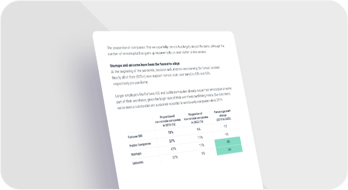 The proportion of companies that were partially remote has largely stayed the same, although the number of remote jobs has gone up exponentially, as seen earlier in this section. Startups and unicorns have been the fastest to adapt At the beginning of the pandemic, startups and unicorns were among the fastest to adapt. Nearly all of them (90%+) now support remote work, compared to 53% and 63% respectively pre-pandemic. Larger employers like Fortune 500 and public companies already supported remote jobs in some part of their workforce, given the larger size of their workforce and hiring needs. But even there, we’ve seen a substantial and sustained reduction in onsite-only companies since 2019. © Tapwage Inc 2022 11