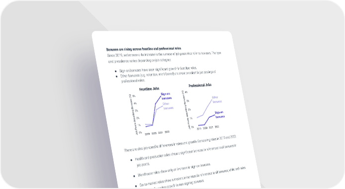 Bonuses are rising across frontline and professional roles Since 2019, we’ve seen a 4x increase in the number of job posts that refer to bonuses. The type and prevalence varies depending on job category: ● Sign-on bonuses have seen significant growth in frontline roles. ● Other bonuses (e.g. retention, merit-based) are more prevalent in job postings of professional roles. There are also job-specific differences in rates and growth. Comparing rates in 2019 and 2022: ● Health and production roles show a significant increase in references to all bonuses in job posts. ● Warehouse roles show only an increase in sign-on bonuses. ● Go-to-market roles show a moderate increase in references to all bonuses, while tech roles are primarily seeing growth in non-signing bonuses. © Tapwage Inc 2022 18
