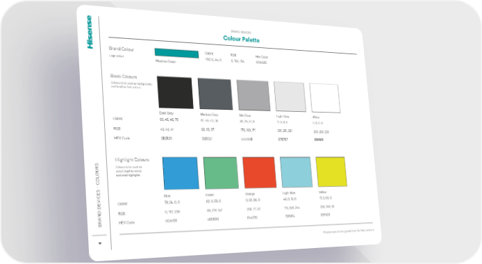 BRAND DEVICES Colour Palette BRAND DEVICES - COLOURS 13 Highlight Colours Colours to be used on select headline words and small highlights. Block Colours Colours to be used as backgrounds and headline font colours. Green 62, 0, 58, 0 Orange 0, 82, 86, 0 Light Blue 48, 0, 16, 0 Yellow 17, 0, 90, 0 Dark Grey 60, 45, 45, 75 Medium Grey 61, 48, 43, 38 Light Grey 11, 8, 9, 0 Mid Grey 36, 28, 27, 6 White 0, 0, 0, 0 CMYK RGB HEX Code CMYK RGB HEX Code FA4720 73F9F4 EEF923 2B2B29 585C61 E7E7E7 FFFFFF AAA9AB Blue 73, 24, 0, 0 45DB93 00A1EE Brand Colour CMYK 100, 0, 44, 0 Hisense Green RGB 0, 154, 154 Hex Code 009A9D Logo colour 69, 219 ,147 250 ,71, 32 115, 249, 244 238, 249, 35 0, 161, 238 Please see online guidelines for Hex colours 88, 92, 97 231, 231, 231 170, 169, 171 43, 43, 41 255 ,255, 255
