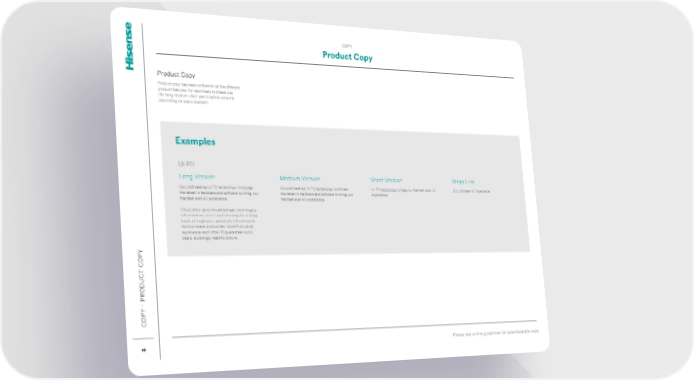 COPY Product Copy COPY - PRODUCT COPY 16 Examples Long Version Groundbreaking ULED technology combines the latest in hardware and software to bring you the best ever 4K experience. Ultra Colour gives breathtakingly vivid images, Ultra Contrast uses Local Dimming for striking levels of brightness and depth, Ultra Smooth Motion means a smoother, more fluid visual experience, and Ultra HD guarantees a pin sharp, stunningly realistic picture. Medium Version Groundbreaking ULED technology combines the latest in hardware and software to bring you the best ever 4K experience. Short Version ULED technology brings you the best ever 4K experience. Strap Line Our Ultimate 4K Experience. ULED Please see online guidelines for downloadable copy Product Copy Product copy has been written for all the different product features. For each feature please use the long, medium, short and strapline versions depending on space available.