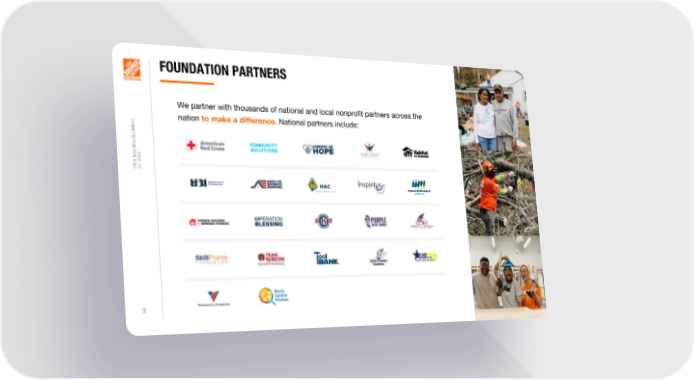 Home Depot Brand Book Page 2 Page 43 FOUNDATION PARTNERS We partner with thousands of national and local nonprofit partners across the s nation to make a difference. National partners include: e n i l e d i u G g n i d n a4 r2 B 0 &2 R PQ1 3