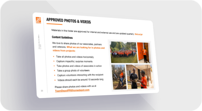 APPROVED PHOTOS & VIDEOS Materials in this folder are approved for internal and external use and are updated quarterly: thd.co/pr s e n i l Content Guidelines e d i u G g n i d We love to share photos of our associates, partners n a4 r2 B 0 &2 and veterans. What we are looking for in photos and R PQ1 videos from projects: § Take all photos and videos horizontally § Capture impactful, surprise moments § Take photos and videos of associates in action § Take a group photo of volunteers § Capture volunteers interacting with the recipient § Videos should each be around 10 seconds long Please share photos and videos with us at 20 [email protected]