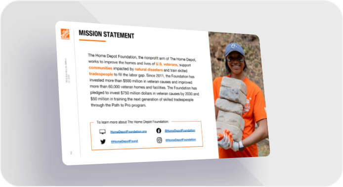 MISSION STATEMENT The Home Depot Foundation, the nonprofit arm of The Home Depot, s e n works to improve the homes and lives of U.S. veterans, support i l e d i u communities impacted by natural disasters and train skilled G g n i d n tradespeople to fill the labor gap. Since 2011, the Foundation has a4 r2 B 0 &2 invested more than $500 million in veteran causes and improved R PQ1 more than 60,000 veteran homes and facilities. The Foundation has pledged to invest $750 million dollars in veteran causes by 2030 and $50 million in training the next generation of skilled tradespeople through the Path to Pro program. To learn more about The Home Depot Foundation: HomeDepotFoundation.org @HomeDepotFoundation @HomeDepotFound @HomeDepotFoundation 2