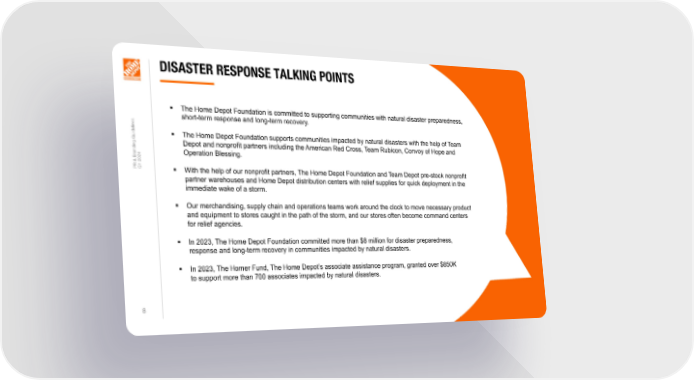 DISASTER RESPONSE TALKING POINTS § The Home Depot Foundation is committed to supporting communities with natural disaster preparedness, s short-term response and long-term recovery. e n i l e d i u § The Home Depot Foundation supports communities impacted by natural disasters with the help of Team G g Depot and nonprofit partners including the American Red Cross, Team Rubicon, Convoy of Hope and n i d n a 4 Operation Blessing. r 2 B 0 & 2 R P Q1 § With the help of our nonprofit partners, The Home Depot Foundation and Team Depot pre-stock nonprofit partner warehouses and Home Depot distribution centers with relief supplies for quick deployment in the immediate wake of a storm. § Our merchandising, supply chain and operations teams work around the clock to move necessary product andequipment to stores caught in the path of the storm, and our stores often become command centers for relief agencies. § In 2023, The Home Depot Foundation committed more than $8 million for disaster preparedness, response and long-term recovery in communities impacted by natural disasters. § In 2023, The Homer Fund, The Home Depot9s associate assistance program, granted over $850K to support more than 700 associates impacted by natural disasters. 8