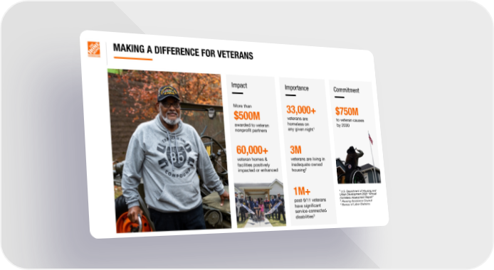 MAKING A DIFFERENCE FOR VETERANS Impact Importance Commitment More than 33,000+ $750M $500M veterans are to veteran causes awarded to veteran homeless on by 2030 nonprofit partners any given night1 60,000+ 3M veteran homes & veterans are living in facilities positively inadequate owned impacted or enhanced housing2 1M+ 1 U.S. Department of Housing and Urban Development 2020 “Annual post-9/11 veterans Homeless Assessment Report” 2 Housing Assistance Council have significant 3 Bureau of Labor Statistics service-connected disabilities3