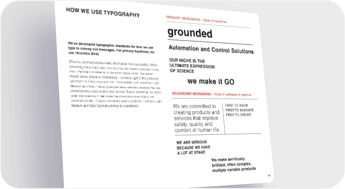 HOW WE USE TYPOGRAPHY PRIMARY MESSAGING– Style of headlines grounded We’ve developed typographic standards for how we use Automation and Control Solutions type to convey our messages. For primary headlines, we use Helvetica Bold. OUR NICHE IS THE Effective communications make information more accessible. When ULTIMATE EXPRESSION formatting body copy, take care to direct the reader’s attention to the OF SCIENCE most important information in the most logical order. The reader should sense structure immediately. Helvetica Light is the preferred we make it GO typestyle for body copy and text. Three weights are permitted: Light, Medium and Bold. These typestyles were selected because they are contemporary classics and easy to read. Space permitting, we prefer SECONDARY MESSAGING– Style of subheads & captions open line spacing. It reinforces the strong horizontal flow of our communications. If space limitations pose a problem, Helvetica Light, Medium and Bold Condensed may be substituted. We are committed to FIRST TO KNOW creating products and FIRST TO INNOVATE services that improve FIRST TO CREATE safety, quality and comfort of human life. WE ARE SERIOUS BECAUSE WE HAVE A LOT AT STAKE We make terrifically brilliant, often complex, multiple variable products 19