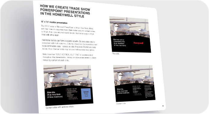 HOW WE CREATE TRADE SHOW POWERPOINT PRESENTATIONS IN THE HONEYWELL STYLE 10" x 7.5" monitor presentation The TITLE copy in Microsoft PowerPoint is 24 pt. Arial Bold, White, with four lines of copy maximum. Main bullet copy for content slides is 14 pt. Arial. Use only red round bullets. Sub bullet copy is 12 pt. Arial with white dash Additional bullets can form a second column. Be sure copy size is consistent with both columns. Columns should not be moved/re-sized to accommodate copy - reduce pt. size if needed. Do not use copy below 10 pt. Content slide may be used with optional inset photo. Title slide Slide transition “SPLIT VERTICAL OUT” FAST is recommended throughout the presentation. Timing for slide advancement is deter- mined by content of each slide. Content slide with optional photo Content slide 50