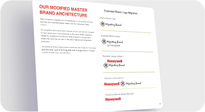 OURMODIFIEDMASTER EEnnddoorrsseedd BBrraanndd LLooggoo MMiiggrraattiioonn BRANDARCHITECTURE Original Brand Logo Brand migration strategies will be developed in consultation with the business unit communications leader and the Honeywell Brand Council. This migration philosophy and strategic process will also be followed for companies and brands acquired in the future. Brand migration Endorsed Brand Lockup should be considered by business units involved in merger and acquisition activities, as part of the due diligence and integration processes. The following brand logo migration examples are shown for illustrative purposes only. Each brand-migration plan is unique and will include specific interim steps and timelines. Transition Lockup Option 1 Transition Lockup Option 2 Product or Service Master Branded 9
