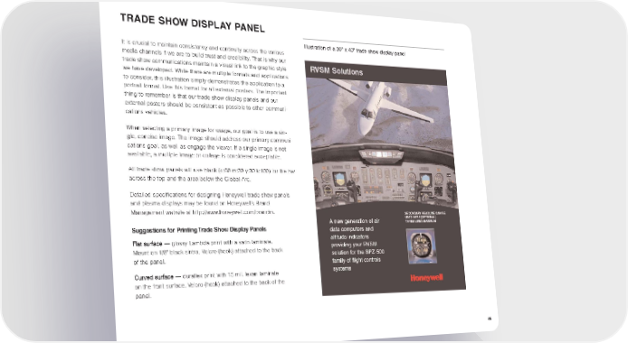 TRADE SHOWDISPLAY PANEL Illustration of a 30" x 40" trade show display panel It is crucial to maintain consistency and continuity across the various media channels if we are to build trust and credibility. That is why our trade show communications maintain a visual link to the graphic style we have developed. While there are multiple formats and applications to consider, this illustration simply demonstrates the application to a portrait format. Use this format for all external posters. The important thing to remember is that our trade show display panels and our external posters should be consistent as possible to other communi- cations vehicles. When selecting a primary image for usage, our goal is to use a sin- gle, concise image. The image should address our primary communi- cations goal, as well as engage the viewer. If a single image is not available, a multiple image or collage is considered acceptable. All trade show panels will use black (c:60 m:30 y:30 k:100) for the bar across the top and the area below the Global Arc. Detailed specifications for designing Honeywell trade show panels and plasma displays may be found on Honeywell’s Brand Management website at http://www.honeywell.com/brandm. Suggestions for Printing Trade Show Display Panels FFllaatt ssuurrffaaccee — glossy Lambda print with a satin laminate. Mount on 1/8" black sintra. Velcro (hook) attached to the back of the panel. CCuurrvveedd ssuurrffaaccee — duraflex print with 15 mil. lexan laminate on the front surface. Velcro (hook) attached to the back of the panel. 46