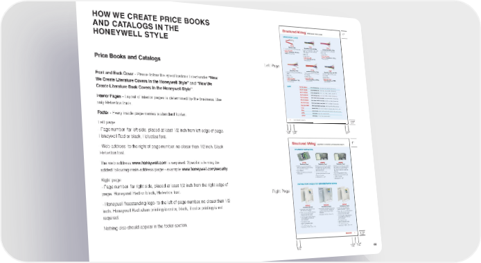 HOW WE CREATE PRICE BOOKS 1" AND CATALOGS IN THE HONEYWELL STYLE Price Books and Catalogs Left Page FFrroonntt aanndd BBaacckk CCoovveerr - Please follow the specifications listed under “How We Create Literature Covers in the Honeywell Style” and “How We Create Literature Back Covers in the Honeywell Style”. IInntteerriioorr PPaaggeess - Layout of interior pages is determined by the business. Use only Helvetica fonts. FFooootteer - Every inside page carries a standard footer: 1/2" Left page - Page number- far left side, placed at least 1/2 inch from left edge of page. 1/2" 1/2" 1/2" Honeywell Red or black, Helvetica font. 1" - Web address- to the right of page number, no closer than 1/2 inch. Black Helvetica font. The web address wwwwww..hhoonneeyywweellll..ccoomm is required. Specific site may be added following main address page - example wwwwww..hhoonneeyywweellll..ccoomm//sseeccuurriittyy Right page - Page number- far right side, placed at least 1/2 inch from the right edge of page. Honeywell Red or black, Helvetica font. Right Page - Honeywell freestanding logo- to the left of page number, no closer than 1/2 inch. Honeywell Red when printing in color, black, if color printing is not required. Nothing else should appear in the footer section. 1/2" 1/2" 1/2" 1/2" 44