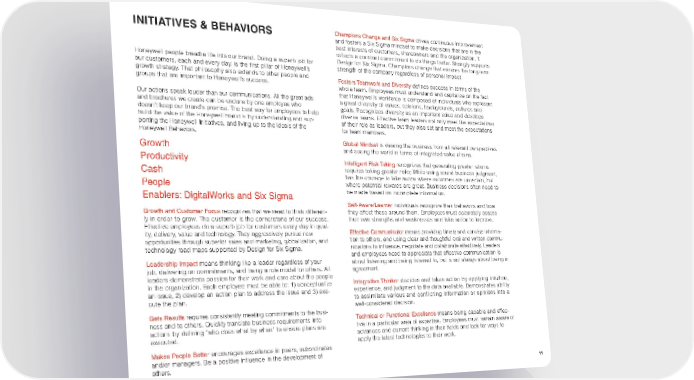INITIATIVES & BEHAVIORS Champions Change and Six Sigma drives continuous improvement and fosters a Six Sigma mindset to make decisions that are in the best interests of customers, shareowners and the organization. It reflects a constant commitment to do things better. Strongly supports Honeywell people breathe life into our brand. Doing a superb job for Design for Six Sigma. Champions change that ensures the long-term our customers, each and every day, is the first pillar of Honeywell’s strength of the company regardless of personal impact. growth strategy. That philosophy also extends to other people and Fosters Teamwork and Diversity defines success in terms of the groups that are important to Honeywell’s success. whole team. Employees must understand and capitalize on the fact Our actions speak louder than our communications. All the great ads that Honeywell’s workforce is composed of individuals who represent and brochures we create can be undone by one employee who a great diversity of values, opinions, backgrounds, cultures and doesn’t keep our brand’s promise. The best way for employees to help goals. Recognizes diversity as an important value and develops build the value of the Honeywell brand is by understanding and sup- diverse teams. Effective team leaders not only meet the expectations porting the Honeywell Initiatives, and living up to the ideals of the of their role as leaders, but they also set and meet the expectations Honeywell Behaviors. for team members. Growth Global Mindset is viewing the business from all relevant perspectives and seeing the world in terms of integrated value chains. Productivity Intelligent Risk Taking recognizes that generating greater returns Cash requires taking greater risks; While using sound business judgment, has the courage to take action where outcomes are uncertain, but People where potential rewards are great. Business decisions often need to Enablers: DigitalWorks and Six Sigma be made based on incomplete information. Self-Aware/Learner individuals recognize their behaviors and how Growth and Customer Focus recognizes that we need to think different- they affect those around them. Employees must accurately assess ly in order to grow. The customer is the cornerstone of our success. their own strengths and weaknesses and take action to improve. Effective employees do a superb job for customers every day in qual- ity, delivery, value and technology. They aggressively pursue new Effective Communicator means providing timely and concise informa- opportunities through superior sales and marketing, globalization, and tion to others, and using clear and thoughtful oral and written commu- technology road maps supported by Design for Six Sigma. nications to influence, negotiate and collaborate effectively. Leaders and employees need to appreciate that effective communication is Leadership Impact means thinking like a leader regardless of your about listening and being listened to, but is not always about being in job, delivering on commitments, and being a role model for others. All agreement. leaders demonstrate passion for their work and care about the people in the organization. Each employee must be able to: 1) conceptualize Integrative Thinker decides and takes action by applying intuition, an issue, 2) develop an action plan to address the issue and 3) exe- experience, and judgment to the data available. Demonstrates ability cute the plan. to assimilate various and conflicting information or opinions into a well-considered decision. Gets Results requires consistently meeting commitments to the busi- ness and to others. Quickly translate business requirements into Technical or Functional Excellence means being capable and effec- actions by defining “who does what by when” to ensure plans are tive in a particular area of expertise. Employees must remain aware of executed. advances and current thinking in their fields and look for ways to apply the latest technologies to their work. Makes People Better encourages excellence in peers, subordinates and/or managers. Be a positive influence in the development of others. 11