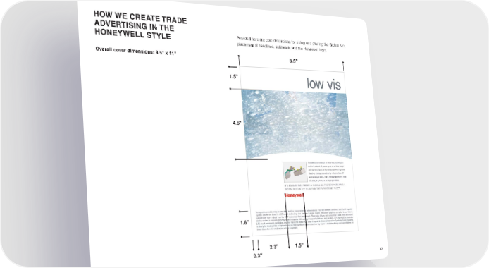 HOWWECREATE TRADE ADVERTISING IN THE Provided here are core dimensions for sizing and placing the Global Arc, HONEYWELLSTYLE placement of headlines, subheads and the Honeywell logo. Overall cover dimensions: 8.5" x 11" 8.5" 1.5" 4.6" 1.6" 2.3" 1.5" 0.3" 27