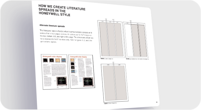 HOWWECREATE LITERATURE SPREADS INTHE HONEYWELLSTYLE 0.25" 0.25" 0.25" 2.33" 2.33" 2.33" 2.33" 4.91" Alternate literature spreads The Honeywell style is flexible when it comes to inside spreads on lit- erature that is four pages or more. All options call for 0.5" margin on the top, bottom, left, and right of the page. The dimensions shown are for a standard 8.5"x11" literature only. Refer to figures 1, 2, and 3 for grid column layouts. FFIIGGUURREE 11.. 3-Column Design Grid FFIIGGUURREE 22.. One-Third/Two-Third or Two-Third/One-Third Design Grid 0.25" 3.625" 3.625" FFIIGGUURREE 33.. 2-Column Design Grid 34