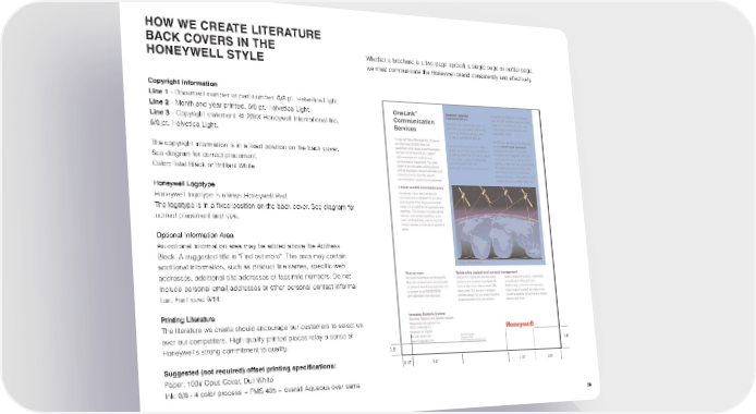 HOWWECREATE LITERATURE BACK COVERS INTHE Whether a brochure is a two-page spread, a single page or partial page, HONEYWELLSTYLE we must communicate the Honeywell brand consistently and effectively. Copyright Information Line 1 - Document number or part number. 6/8 pt. Helvetica Light. Line 2 - Month and year printed. 6/8 pt. Helvetica Light. Line 3 - Copyright statement © 20XX Honeywell International Inc. 6/8 pt. Helvetica Light. The copyright information is in a fixed position on the back cover. See diagram for correct placement. Color: Total Black or Brilliant White HHoonneeyywweellll LLooggoottyyppee Honeywell logotype is always Honeywell Red. The logotype is in a fixed position on the back cover. See diagram for correct placement and size. OOppttiioonnaall IInnffoorrmmaattiioonn AArreeaa An optional information area may be added above the Address Block. A suggested title is "Find out more". This area may contain additional information, such as product line names, specific web addresses, additional site addresses or facsimile numbers. Do not include personal email addresses or other personal contact informa- tion. Font size: 9/14 PPrriinnttiinngg LLiitteerraattuurree The literature we create should encourage our customers to select us over our competitors. High quality printed pieces relay a sense of Honeywell's strong commitment to quality. 1.0" 0.5" Suggested (not required) offset printing specifications: 0.5" 3.0" 1.5" 1.5" Paper: 100# Opus Cover, Dull White Ink: 6/6 - 4 color process + PMS 485 + overall Aqueous over same 36