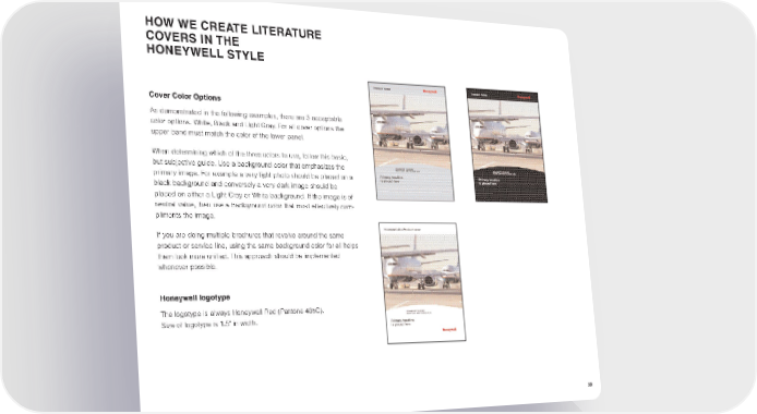 HOWWECREATE LITERATURE COVERS INTHE HONEYWELLSTYLE Cover Color Options As demonstrated in the following examples, there are 3 acceptable color options. White, Black and Light Gray. For all cover options the upper band must match the color of the lower panel. When determining which of the three colors to use, follow this basic, but subjective guide. Use a background color that emphasizes the primary image. For example a very light photo should be placed on a black background and conversely a very dark image should be placed on either a Light Gray or White background. If the image is of neutral value, then use a background color that most effectively com- pliments the image. If you are doing multiple brochures that revolve around the same product or service line, using the same background color for all helps them look more unified. This approach should be implemented whenever possible. Honeywell logotype The logotype is always Honeywell Red (Pantone 485C). Size of logotype is 1.5" in width. 32