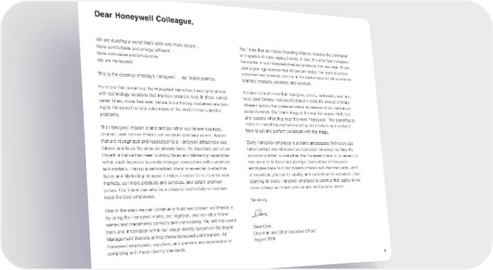 Dear Honeywell Colleague, We are building a world that’s safer and more secure … You’ll note that our master branding initiative includes the elimination More comfortable and energy efficient … or migration of many legacy brands. In fact, this effort has increased More innovative and productive. the portion of our Honeywell-branded products from less than 70 per- We are Honeywell. cent a year ago to more than 90 percent today. The result is a more consistent and powerful position in the marketplace for all our master- This is the essence of today’s Honeywell … our brand promise. branded products, solutions, and services. For more than a century, the Honeywell name has been synonymous A brand is much more than logotypes, colors, trademarks, and busi- with technology solutions that improve people’s lives. In these compli- ness card formats. Honeywell’s brand is really the product of many cated times, more than ever before in our history, customers are turn- different factors that create an overall impression of our company in ing to Honeywell to help solve many of the world's most complex people’s minds. Our brand image is the way that people think, feel, problems. and respond when they hear the word “Honeywell.” The brand has to stand for something and we (including our products and services) The Honeywell master brand and our other well-known business, have to act and perform consistent with that image. product, and service brands are valuable company assets. Brands that are recognized and respected help Honeywell attract new cus- Every Honeywell employee is a brand ambassador. With every cus- tomers and keep the ones we already have. An important part of our tomer contact and whenever we represent Honeywell, we have the Growth initiative has been building Sales and Marketing capabilities opportunity either to strengthen the Honeywell brand or to cause it to within each business to create stronger connections with customers lose some of its luster and prestige. Generations of Honeywell and markets. Having a well-defined brand is essential to effective employees have built our powerful brands with their hard work, spirit Sales and Marketing because it makes it easier for us to enter new of innovation, passion for quality, and commitment to customers. I am markets, sell more products and services, and obtain premium counting on every Honeywell employee to continue that legacy as we prices. Our brand can also be a powerful tool to help us find and strive to keep our brand promise and build a better world. keep the best employees. Sincerely, One of the ways we can continue to build and protect our brands is by using the Honeywell name, our logotype, and our other brand names and trademarks correctly and consistently. You will find useful tools and information within our visual identity system on the Brand Dave Cote Management Website at http://www.honeywell.com/brandm. All Chairman and Chief Executive Officer Honeywell employees, suppliers, and partners are responsible for August 2004 complying with these identity standards. 2