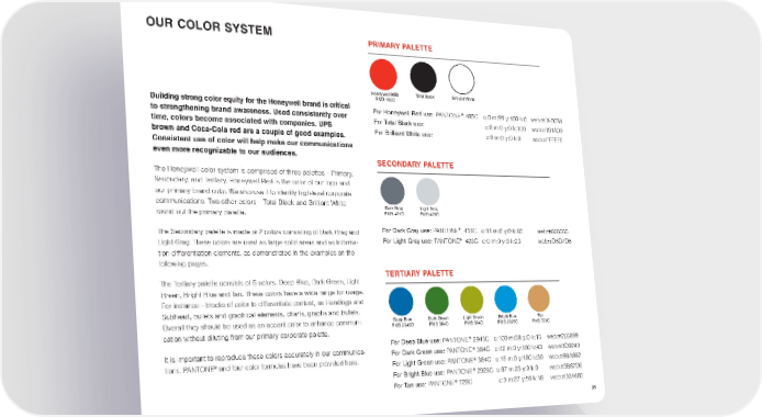 OUR COLOR SYSTEM PRIMARY PALETTE Honeywell RED Total Black Brilliant White PMS 485C Building strong color equity for the Honeywell brand is critical ® to strengthening brand awareness. Used consistently over For Honeywell Red use: PANTONE 485C c:0 m:95 y:100 k:0 web:#DE0031 time, colors become associated with companies. UPS For Total Black use: c:0 m:0 y:0 k:100 web:#191A00 brown and Coca-Cola red are a couple of good examples. For Brilliant White use: c:0 m:0 y:0 k:0 web:#FFFFFF Consistent use of color will help make our communications even more recognizable to our audiences. SECONDARY PALETTE The Honeywell color system is comprised of three palettes – Primary, Secondary, and Tertiary. Honeywell Red is the color of our logo and our primary brand color. We also use it to identify high-level corporate communications. Two other colors – Total Black and Brilliant White – Dark Gray Light Gray round out the primary palette. PMS 431C PMS 428C ® The Secondary palette is made of 2 colors consisting of Dark Gray and For Dark Gray use: PANTONE 431C c:11 m:0 y:0 k:65 web:#666666 ® Light Gray. These colors are used as large solid areas and as informa- For Light Gray use: PANTONE 428C c:0 m:0 y:0 k:23 web:#D6D7D6 tion differentiation elements, as demonstrated in the examples on the following pages. TERTIARY PALETTE The Tertiary palette consists of 5 colors. Deep Blue, Dark Green, Light Green, Bright Blue and Tan. These colors have a wide range for usage. For instance – blocks of color to differentiate content, as Headings and Subhead, bullets and graphical elements, charts, graphs and bullets. Overall they should be used as an accent color to enhance communi- Deep Blue Dark Green Light Green Bright Blue Tan PMS 2945C PMS 364C PMS 384C PMS 2925C PMS 729C cation without diluting from our primary corporate palette. For Deep Blue use: PANTONE® 2945C c:100 m:38 y:0 k:15 web:#2E6099 It is important to reproduce these colors accurately in our communica- For Dark Green use: PANTONE® 364C c:72 m:0 y:100 k:43 web:#3D9240 tions. PANTONE® and four color formulas have been provided here. For Light Green use: PANTONE® 384C c:15 m:0 y:100 k:30 web:#8BA862 ® For Bright Blue use: PANTONE 2925C c:87 m:23 y:0 k:0 web:#3B87DE For Tan use: PANTONE® 729C c:0 m:27 y:56 k:18 web:#D0A660 21