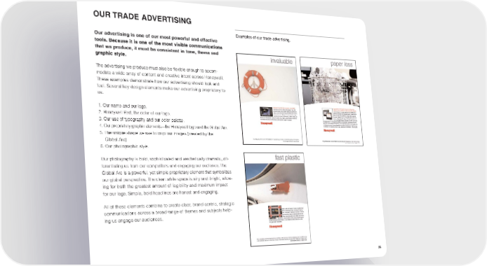 OUR TRADE ADVERTISING Examples of our trade advertising. Our advertising is one of our most powerful and effective tools. Because it is one of the most visible communications that we produce, it must be consistent in tone, theme and graphic style. low vis The advertising we produce must also be flexible enough to accom- modate a wide array of content and creative intent across Honeywell. These examples demonstrate how our advertising should look and feel. Several key design elements make our advertising proprietary to us. The difference between passengers arriving on 1. Our name and our logo. schedule or late, or on-time cargo and day-late cargo, is the Honeywell Digital Head-Up Display system.The Digital HUD system improves operations 2. Honeywell Red, the color of our logo. by reducing take-off and landing minima on those days when the weather just will not cooperate . 3. Our use of typography and our color palette. 4. Our proprietary graphic elements—the Honeywell logo and the Global Arc. 5. The unique shape we use to crop our images (created by the Honeywell’s Digital HUD is the leading edge in high performance flight guidance systems, delivering the highest level Global Arc) of safety to airline operations. For further information, call 1-877-484-2979. Outside the U.S.A. call +1 602-436-0272. 6. Our photographic style. Our photography is bold, sophisticated and aesthetically dramatic, dif- ferentiating us from our competitors and engaging our audience. The Global Arc is a powerful, yet simple proprietary element that symbolizes our global perspective. The clean white space is airy and bright, allow- ing for both the greatest amount of legibility and maximum impact for our logo. Simple, bold headlines are honest and engaging. All of these elements combine to create clear, brand-centric, strategic communications across a broad range of themes and subjects help- ing us engage our audiences. 25