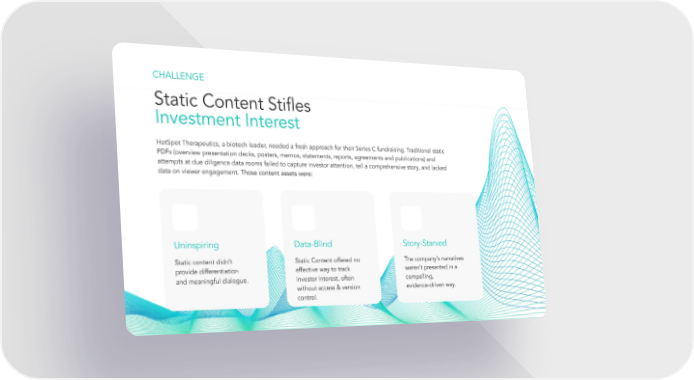 CHALLENGE Static Content Stifles Investment Interest HotSpot Therapeutics, a biotech leader, needed a fresh approach for their Series C fundraising. Traditional static PDFs (overview presentation decks, posters, memos, statements, reports, agreements and publications) and attempts at due diligence data rooms failed to capture investor attention, tell a comprehensive story, and lacked data on viewer engagement. Those content assets were: Uninspiring Data-Blind Story-Starved Static content didn't Static Content offered no The company's narratives provide differentiation effective way to track weren’t presented in a and meaningful dialogue. investor interest, often compelling, without access & version evidence-driven way. control.