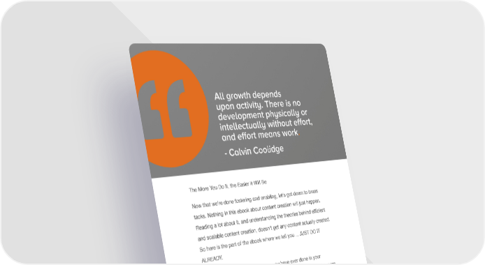 16 HOW HUBSPOT DOES INBOUND: CREATING A CONTENT MACHINE All growth depends upon activity. There is no development physically or intellectually without effort, and effort means work. - Calvin Coolidge The More you do It, the Easier It Will be Now that we’re done fostering and enabling, let’s get down to brass tacks. Nothing in this ebook about content creation will just happen. Reading a lot about it, and understanding the theories behind efficient and scalable content creation, doesn’t get any content actually created. So here is the part of the ebook where we tell you ... JUST dO IT ALrEAdy. This may be the most painful thing you have ever done in your marketing career. Or it may not be that bad at all. Either way, the more you do it, and the more you encourage colleagues and employees to do it, the easier and more natural and frequent content creation will become. www.Hubspot.com