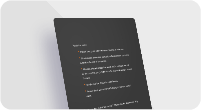 7 HOW HUBSPOT DOES INBOUND: CREATING A CONTENT MACHINE Here’s the reality: • Publish blog posts when someone has time to write one. • Plan to create a new lead generation offer all month, crank one out before the end of the quarter. • Maintain a largely image-free social media presence, except for the ones that get pulled in from the blog posts you put on your Timeline. • Newsjacks a few days after news breaks. • remain about 12 months behind adoption of new content trends. Some -- or all -- of that feel familiar? What’s with the disconnect? Why can’t dreams become reality? At the risk of sounding like a disney movie, your dream of turning your company into a content creation machine can come true. downloading this ebook that outlines HubSpot’s own content creation methodology was the first step; reading on will show you exactly how to do it yourself, building your company’s content machine from the ground up. www.Hubspot.com www.Hubspot.com