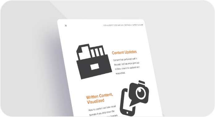 36 HOW HUBSPOT DOES INBOUND: CREATING A CONTENT MACHINE Content Updates Content that performed well in the past, but has since gone out of date, should be updated and relaunched. written Content, Visualized How-to content can take visual formats if you strip down the copy, and reformat the headers into one-sheeters or checklists. These are perfect for social media, particularly Facebook and Pinterest. www.Hubspot.com
