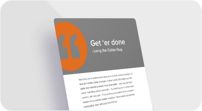24 HOW HUBSPOT DOES INBOUND: CREATING A CONTENT MACHINE Get ‘er done. - larry the Cable Guy Now that you’ve started exercising your content creation muscles, it’s time do it better, faster, stronger. In other words, let’s make your life easier and marketing results more remarkable -- yes, you can have better marketing and an easier life -- by enabling you to create more content, with less pain. This is where you transform from a content creator, into a content creation machine. This is where you become unstoppable. Now, let’s jump into the tips. www.Hubspot.com