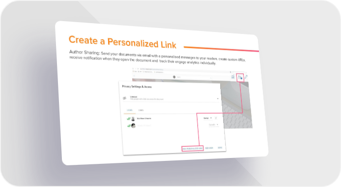 Create a Personalized Link Author Sharing: Send your documents via email with a personalised messages to your readers, create custom URLs, receive notiļ¬cation when they open the document and track their engage analytics individually.