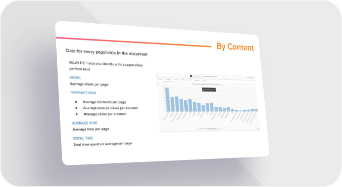 By Content Data for every page/slide in the document RELAYTO/ helps you identify which pages/slides perform best: VIEWS Average views per page INTERACTIONS ● Average elements per page ● Average popups views per element ● Average clicks per element AVERAGE TIME Average time per page TOTAL TIME Total time spent on average per page