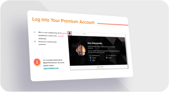 Log into Your Premium Account 1. Click on your company logo in the top left-hand corner of the dashboard 2. Enter your username and password For more information about RELAYTOs Premium Accounts i please contact [email protected]