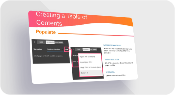 Creating a Table of Contents Populate IMPORT PDF BOOKMARKS Bookmarks that are added to the document before uploading it onto RELAYTO will be extracted IMPORT PAGE TITLES RELAYTO extracts the titles of the uploaded pages or slides REMOVE ALL Deletes all the extracted titles
