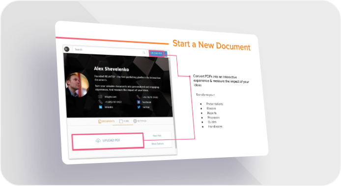 How to Augment, Access, Analyze your Docs Page 3 Page 5Start a New Document Convert PDFs into an interactive experience & measure the impact of your ideas Transform your: ● Presentations ● Ebooks ● Reports ● Proposals ● Guides ● Handbooksks