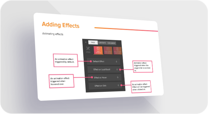 Adding Effects Animating effects An animation effect triggered by default. Animation effect triggered when the page/slide is scrolled to. An animation effect triggered when hovered over. An animation effect Effect will be triggered when clicked on.