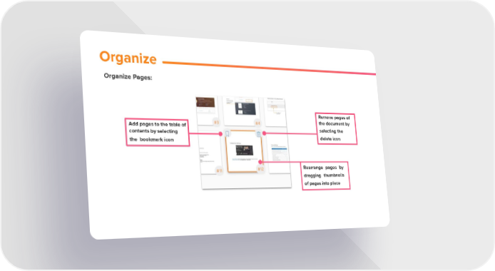 Organize Organize Pages: Remove pages of the document by Add pages to the table of selecting the contents by selecting delete icon the bookmark icon Rearrange pages by dragging thumbnails of pages into place