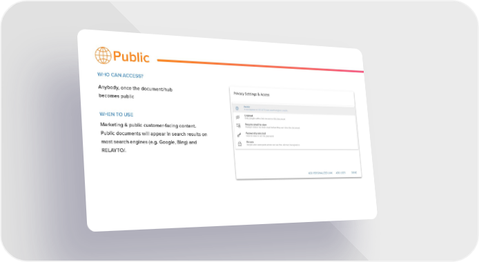 Public WHO CAN ACCESS? Anybody, once the document/hub becomes public WHEN TO USE Marketing & public customer-facing content. Public documents will appear in search results on most search engines (e.g. Google, Bing) and RELAYTO/.