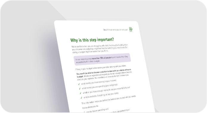 Step 1 Know what you’ve really got 1 Why is this step important? We know that when you are struggling with debt, the thought of writing down your income and outgoings might feel like the last thing you want to do. But doing a budget might be easier than you think. In our recent survey more than 75% of people found it easier than they expected to fill in their budget. Filling in your budget is the starting point for dealing with your debts. You won't be able to choose a solution to deal with your debts without a budget. All advice agencies will expect you to do a budget before they can discuss your options. Your creditors will also ask for one. It shows you: what money you have coming in (your income); what money you are spending (your outgoings); whether you have enough money to pay your essential bills; and what is available, if anything, to pay your debts. This information helps you to find the best solution to deal with your debts. It also allows you to: plan for future spending; and protect yourself against the stress that unexpected bills or increased costs can cause. Arjun, 62, from Newport said: “My advice would be to take a nice deep slow breath. It might seem daunting, but facing it head on will improve your life in the long run.” Page 13