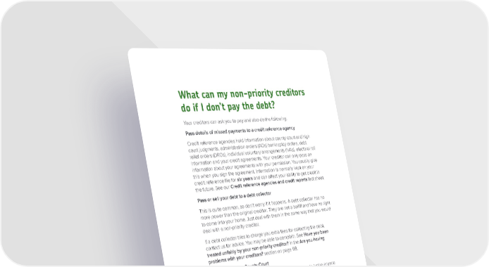 What can my non-priority creditors do if I don’t pay the debt? Your creditors can ask you to pay and also do the following. Pass details of missed payments to a credit reference agency Credit reference agencies hold information about county court and high court judgments, administration orders (AOs) bankruptcy orders, debt relief orders (DROs), individual voluntary arrangements (IVAs), electoral roll information and your credit agreements. Your creditor can only pass on information about your agreements with your permission. You usually give this when you sign the agreement. Information is normally kept on your credit reference file for six years and can affect your ability to get credit in the future. See our Credit reference agencies and credit reports fact sheet. Pass or sell your debt to a debt collector This is quite common, so don’t worry if it happens. A debt collector has no more power than the original creditor. They are not a bailiff and have no right to come into your home. Just deal with them in the same way that you would deal with a non-priority creditor. If a debt collector tries to charge you extra fees for collecting the debt, contact us for advice. You may be able to complain. See Have you been treated unfairly by your non-priority creditor? in the Are you having problems with your creditors? section on page 98. Take action in the County Court The County Court is not a criminal court and is not there to judge anyone guilty or innocent. It simply settles disputes about money owed, and how to repay it. The court expects you and your creditor to do all you can to avoid court action. If your creditor is planning to start court action, they should send you a letter beforehand. This gives information about the debt and how to contact them to discuss payment. It should also include a reply form. See our County Court – pre-action protocol for debt claims fact sheet. Just because a creditor can take action in the County Court doesn’t mean that they will. If they do, most procedures are through the post or online. Usually you won’t have to go to a hearing. You will get a claim form and have the chance to say whether you agree you owe the money or not. Page 92