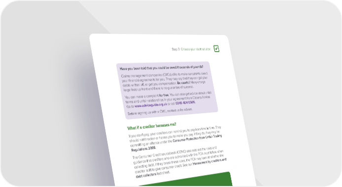 Step 3 Choose your debt solution 3 Have you been told that you could be owed thousands of pounds? Claims management companies (CMCs) offer to make complaints about your financial agreements for you. They may say that they can get your debts written off, or get you compensation. Be careful! Many charge large fees up front and there is no guarantee of success. You can make a complaint for free. You can also get advice about unfair terms and unfair relationships in your agreement from Citizens Advice. Go to www.adviceguide.org.uk or call 0345 404 0506. Before signing up with a CMC, contact us for advice. What if a creditor harasses me? If you don’t pay, your creditors can remind you to pay from time to time. They should not threaten or harass you to make you pay. If they do, they may be committing an offence under the Consumer Protection from Unfair Trading Regulations 2008. The Consumer Credit sourcebook (CONC) also sets out the rules and guidance that creditors who are authorised with the FCA must follow when collecting debt. If they break these rules, the FCA may look at whether the creditor is fit to give consumer credit. See our Harassment by creditors and debt collectors fact sheet. Next steps Congratulations. You have now completed all three steps in the guide. We hope you feel better able to deal with your debts. Remember we are always here to help. You can contact us for advice if: • you are unsure of anything; • you have extra questions; • your circumstances change; or • you just want to talk through your situation. Page 99